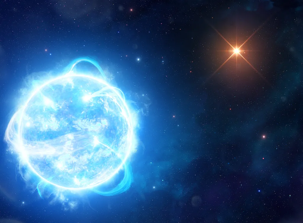 Larger stars: Explodes into a magnificent supernova! The material from the supernova can collect in nebulae, and get recycled into new stars. After the dust clears, a neutron star is left behind, with streams of radiation, called pulsars.